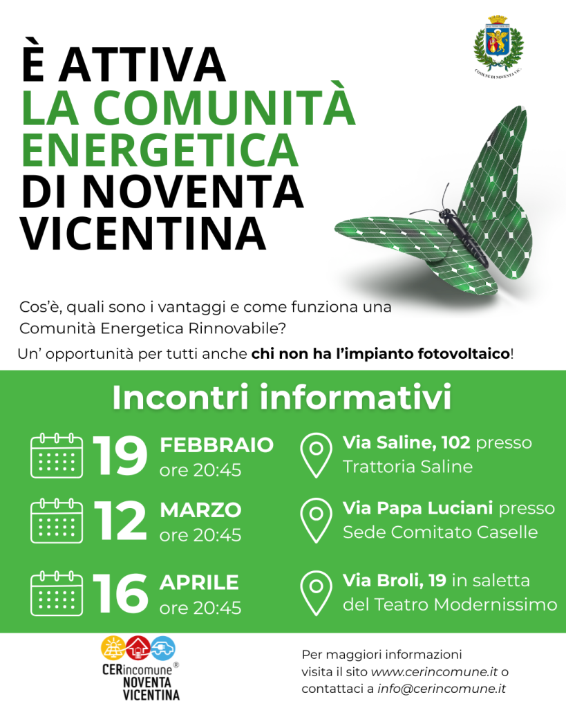 Scopri come funziona la Comunità Energetica Rinnovabile di Noventa Vicentina! Partecipa all’incontro informativo e scopri come cittadini e imprese possono condividere energia in modo sostenibile.